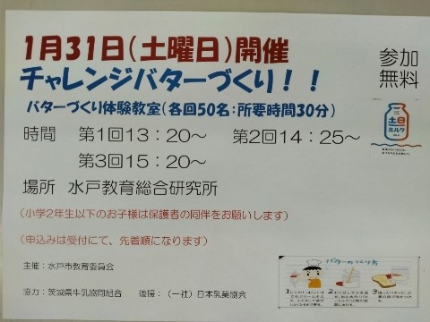 告知 2026年1月31日 水戸市食育大会(水戸教育総合研究所)にて「バターづくり教室」を開催します。皆様のご参加をお待ちしています。